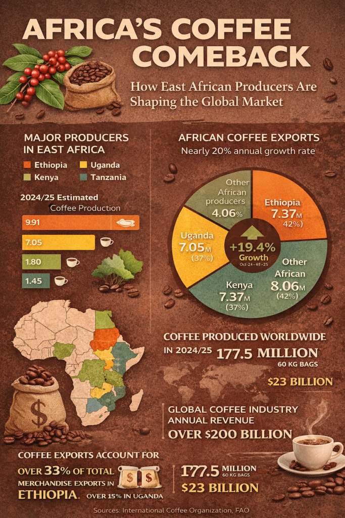 This is not a one-off. Africa’s share of global coffee exports has been quietly rising, now around 14 percent, even as South America’s dominance has slipped and Asia—driven by Vietnam and Indonesia—has surged. Ethiopia, Uganda, Kenya, Tanzania, Rwanda, and Burundi are no longer peripheral suppliers; they are increasingly price-setters at the margin, particularly in Arabica and higher-quality Robusta segments. Producer prices reflect that shift. In 2024, farm-gate prices rose nearly 18 percent in Ethiopia and more than 12 percent in Kenya, offering rare relief to growers squeezed by years of volatility.